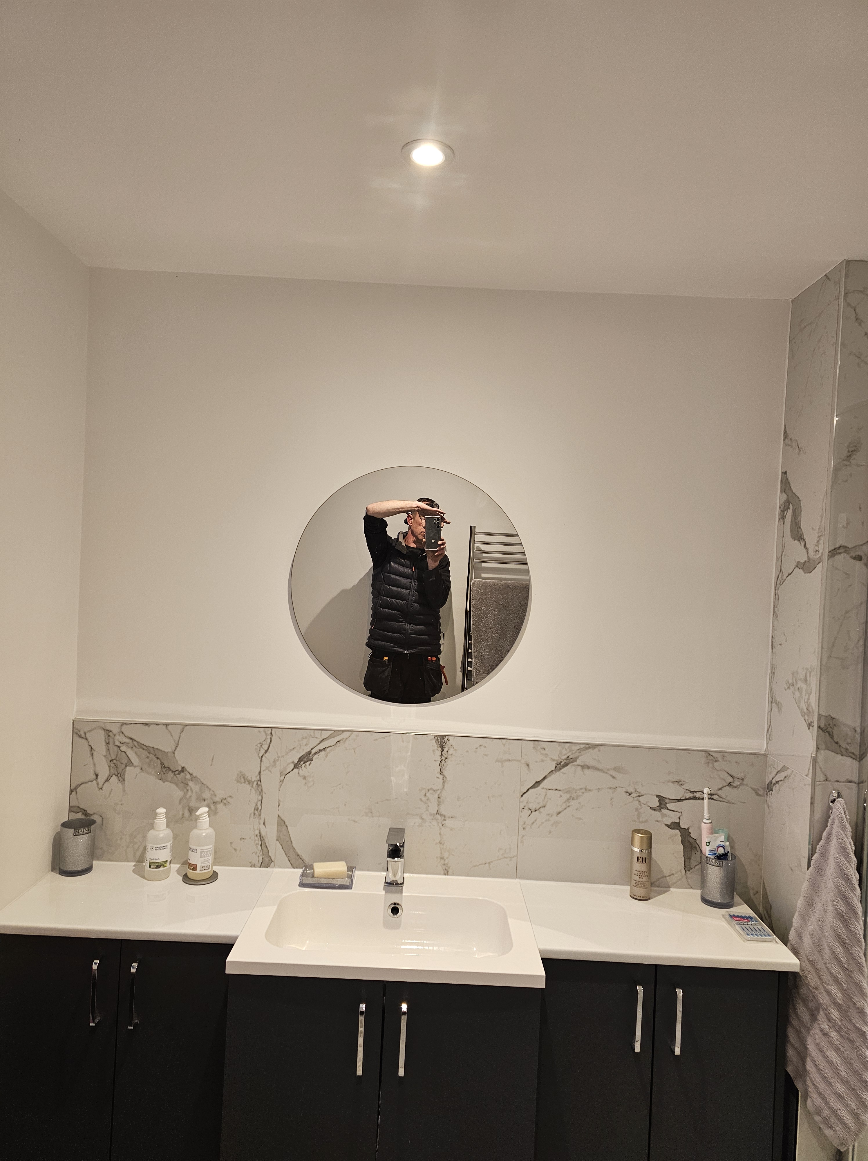 This is a photo of work I did to install and wire a back-lit mirror in a shower room conversion in Stafford, Staffordshire. As you can see from the image, it was a character property that required a bespoke solution to achieve the effect that the customer wanted – I’m pleased to say that they were very pleased with the results!